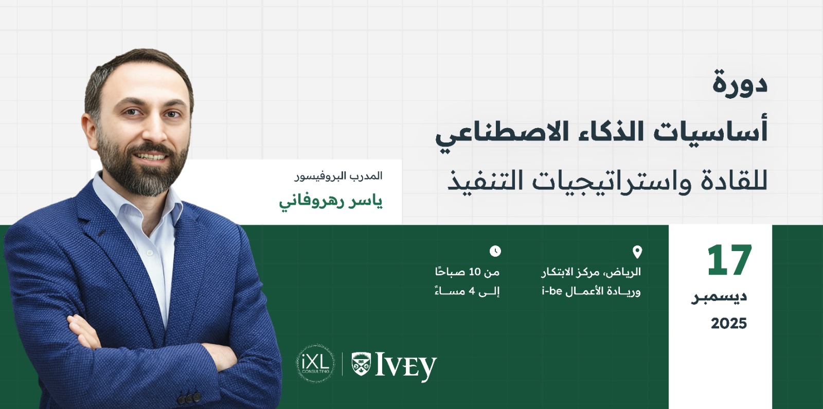 يُعدّ البروفيسور ياسر رهروفاني أحد أبرز المتخصصين في التحول الرقمي والذكاء الاصطناعي في Ivey Business School، حيث يشغل منصب عضو هيئة التدريس ويساهم في تطوير فهم القيادات وصنّاع القرار للتقنيات الحديثة ودورها في إعادة تشكيل المنظمات. يعمل البروفيسور ياسر مع قادة من مختلف القطاعات لتمكينهم من إتقان وفهم الذكاء الاصطناعي، وتحويل هذا الفهم إلى استراتيجيات عملية قابلة للتطبيق داخل مؤسساتهم.