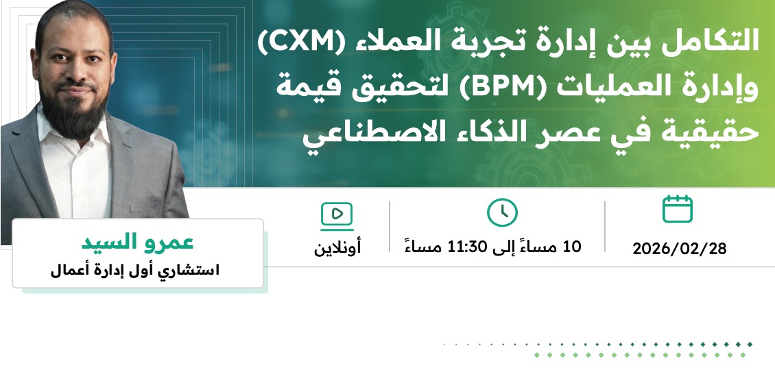 في هذه الندوة التفاعلية، sنستكشف كيف يمكن الجمع بين إدارة تجربة العملاء (CXM) وإدارة العمليات (BPM) ضمن إطار متكامل مدعوم بالذكاء الاصطناعي، لتحويل البيانات إلى قرارات، والعمليات إلى تجارب، والتجارب إلى نتائج قابلة للقياس.